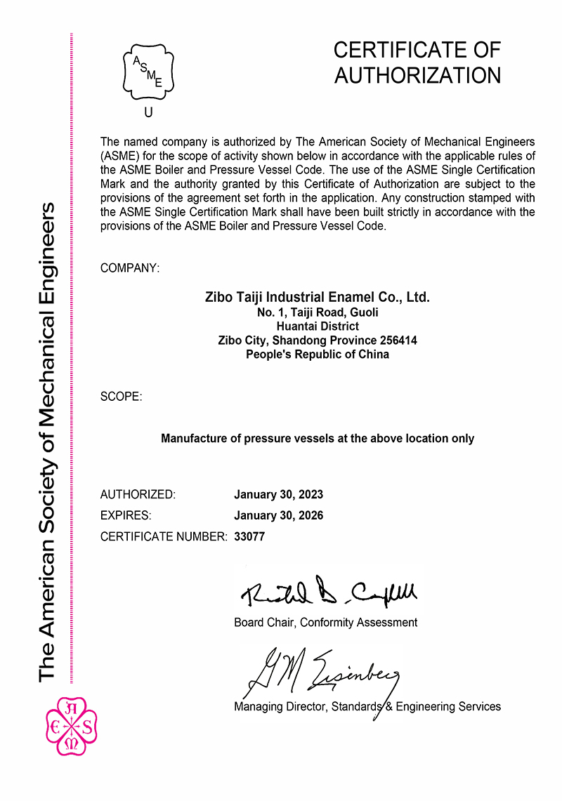 淄博太極在中國(guó)搪玻璃設(shè)備制造行業(yè)中首家通過ISO90001質(zhì)量體系認(rèn)證,并擁有美國(guó)ASME認(rèn)證、歐洲PED認(rèn)證以及國(guó)家部門頒發(fā)的搪玻璃制造許可證、進(jìn)出口許可證和百余項(xiàng)榮譽(yù)證以及三十六項(xiàng)專利等。